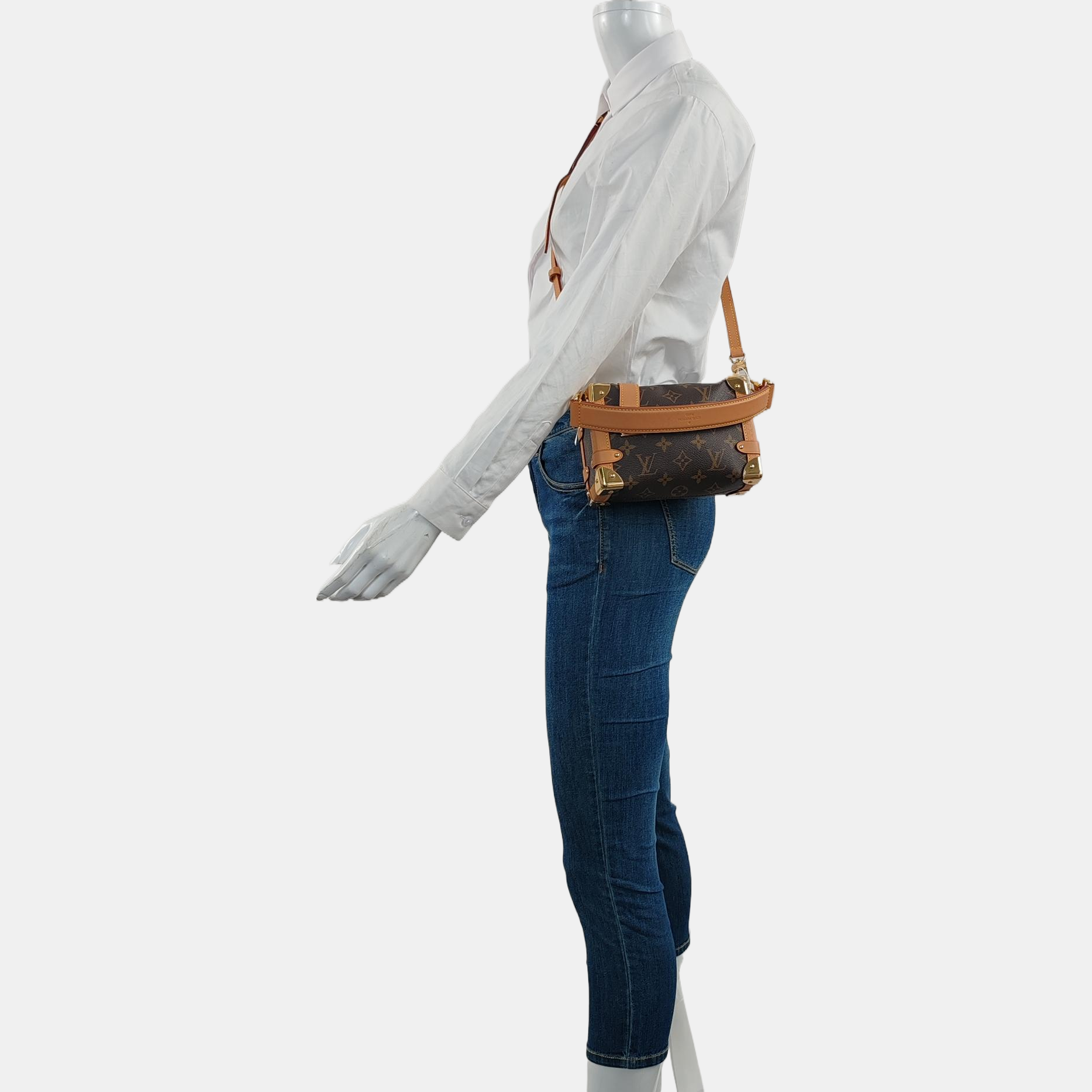 LOUIS VUITTON SIDE TRUNK Small Size Brown Coated Canvas Monogram Stud Soft Box Single Shoulder Bag Tote Bag Crossbody Bag with Detachable Straps-(SKU)-969906636