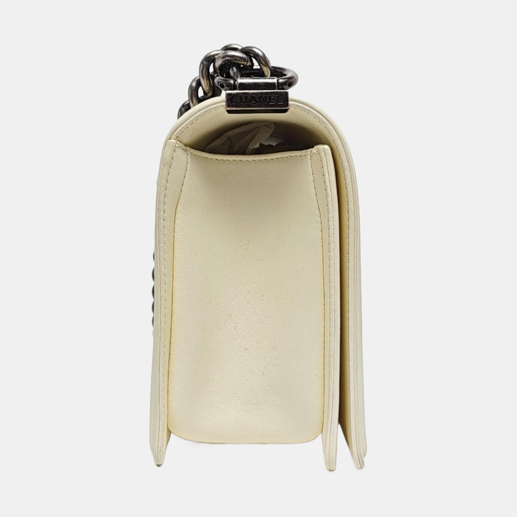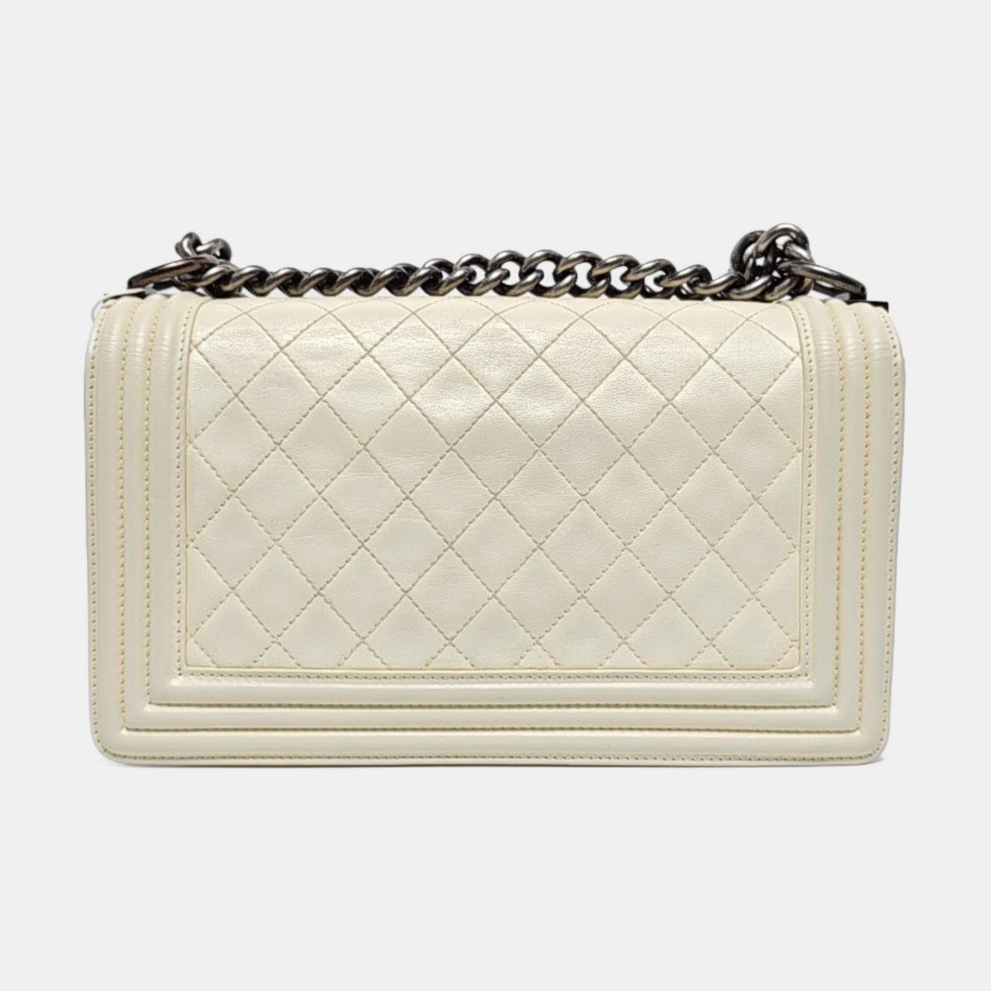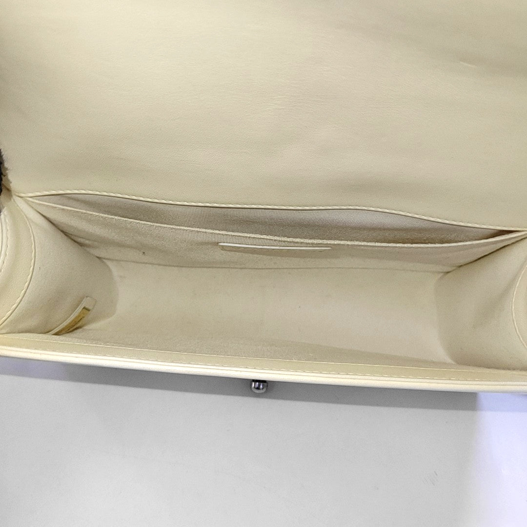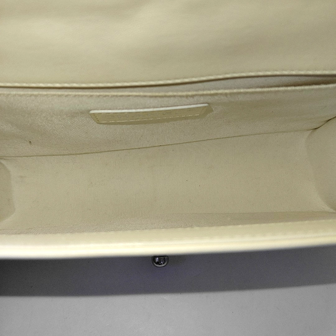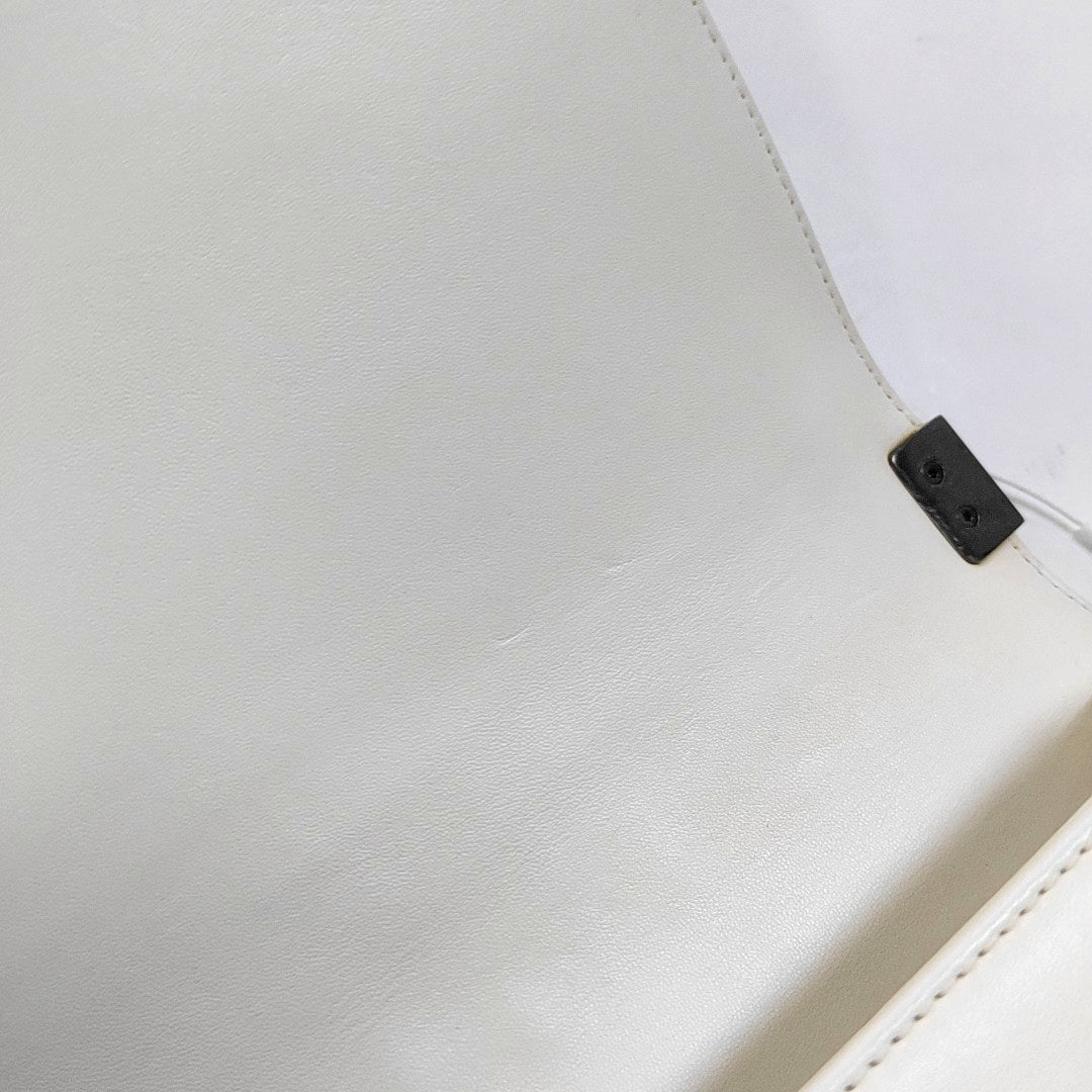 CHANEL BOY CHANEL Medium Size White Lamb Calfskin Quilted Chevron Crossbody Shoulder Bag Rhodium Plated Hardware 18 Clasp Removable Shoulder Strap-(SKU)-968095013