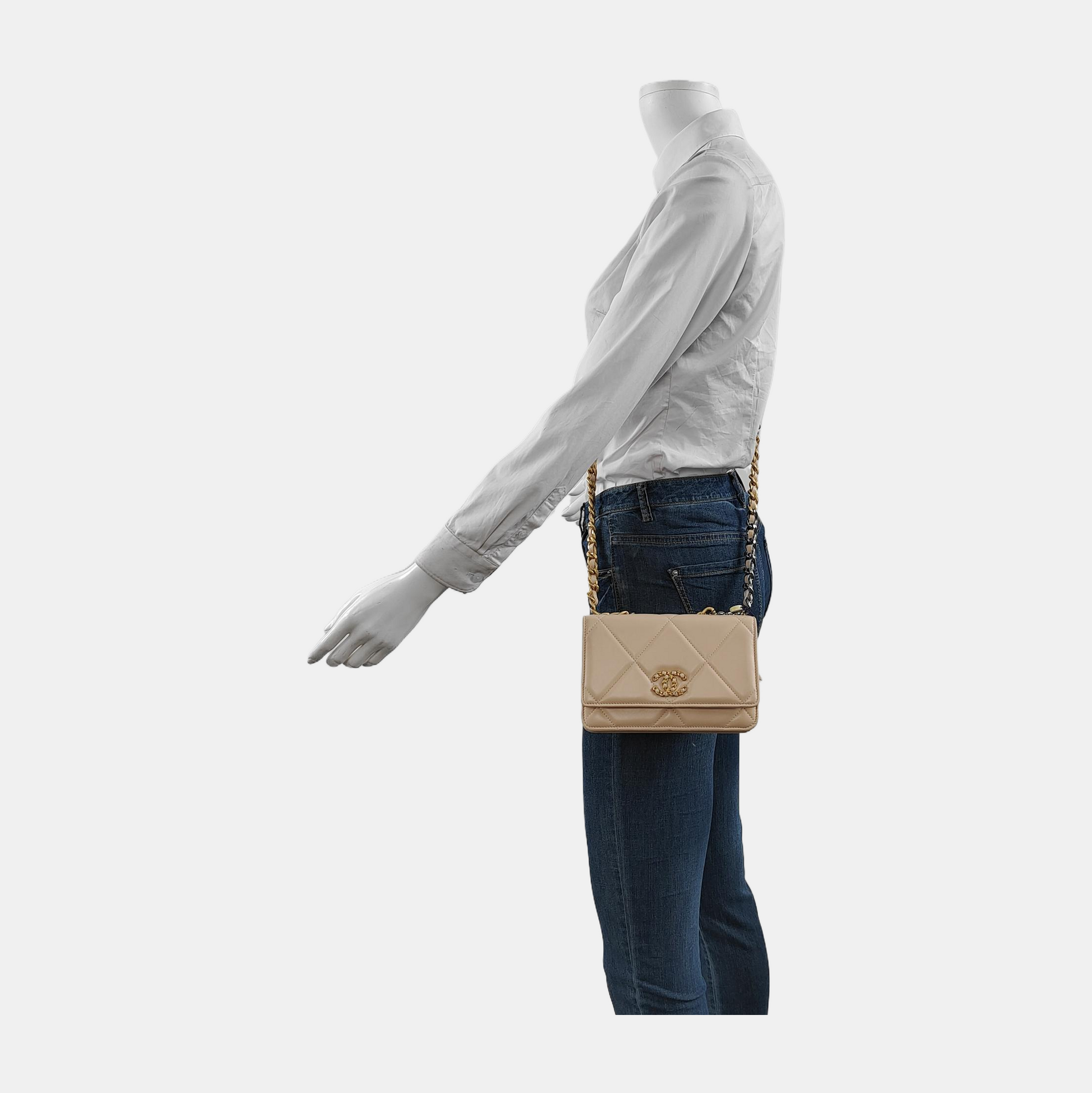 CHANEL CHANEL 19 WOC Beige Lamb Skin Quilted Stitched Crossbody Shoulder Bag Handbag Tote Bag Golden Silver Rhodium Hardware 31 Clasp-(SKU)-949178375