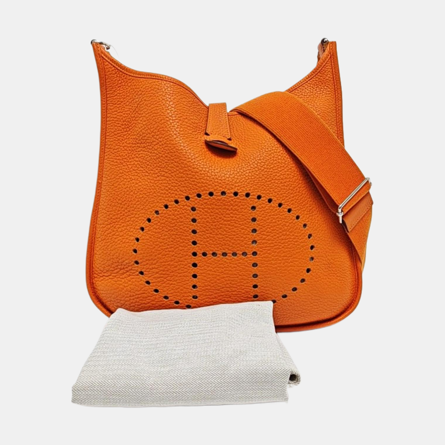 HERMÈS Evelyne GM Hermes orange Clemence leather Evelyne GM bag crossbody bag with handle, silver hardware, embossed H, removable shoulder strap-(SKU)-961912745