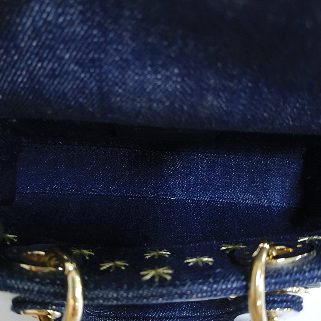 DIOR Lady D-Joy Super Mini Blue Denim Embroidered Crossbody Shoulder Bag Tote Bag Golden Hardware 2 Removable Shoulder Straps Complete Accessories-(SKU)-965662345