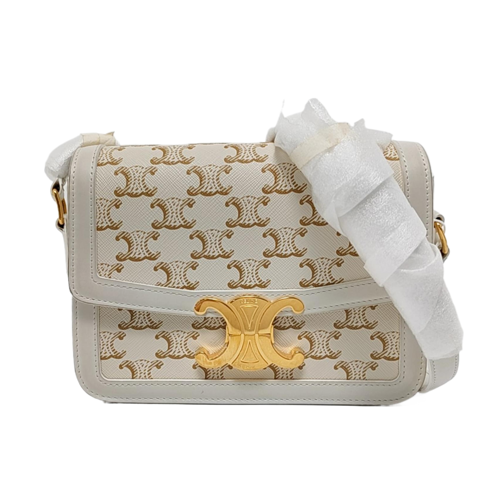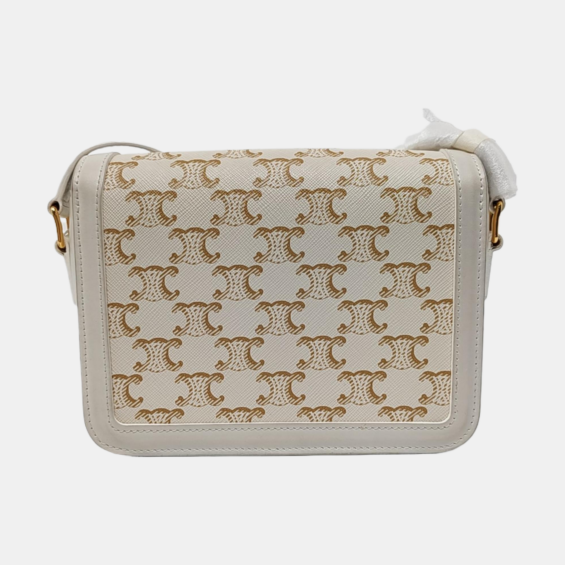 CELINE TRIOMPHE Small White Coated Canvas Triomphe Crossbody Single Shoulder Bag with Gold Hardware-(SKU)-953576570
