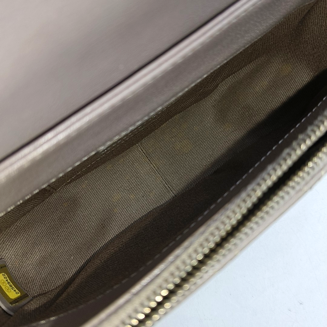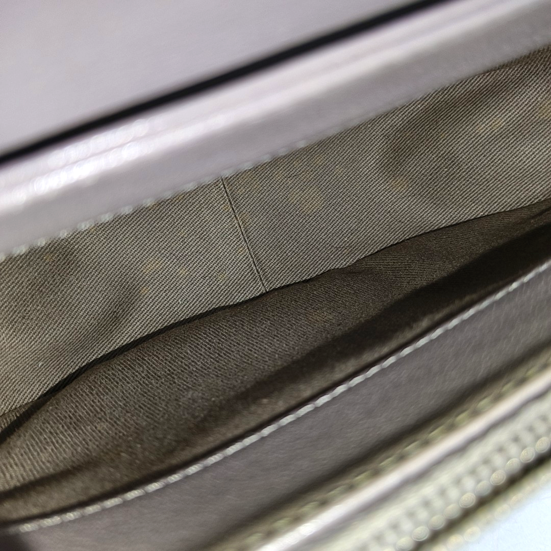Detailed description: Strap、Edge wrapping around the opening、Hardware buckle with moderate scratches、Front、Inside of the flip cover、Back side、Slight stains on the hardware,Inside of the flip cover、Outside of the flip cover、Slight creases on the back side,Peeling coating on the hardware,Moderate stains on the interior