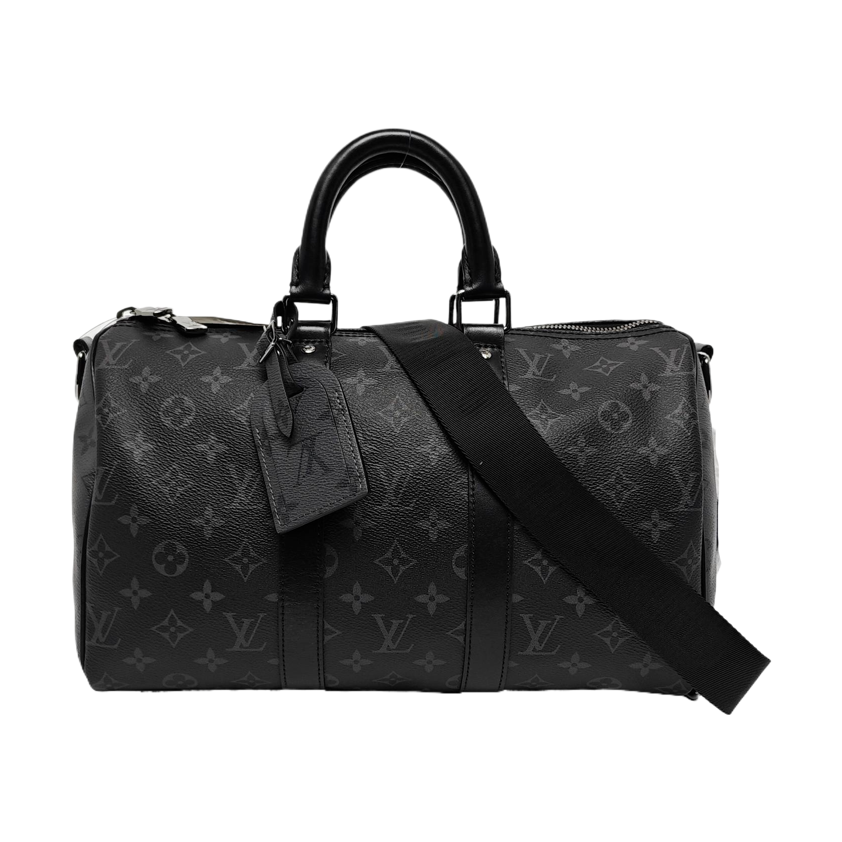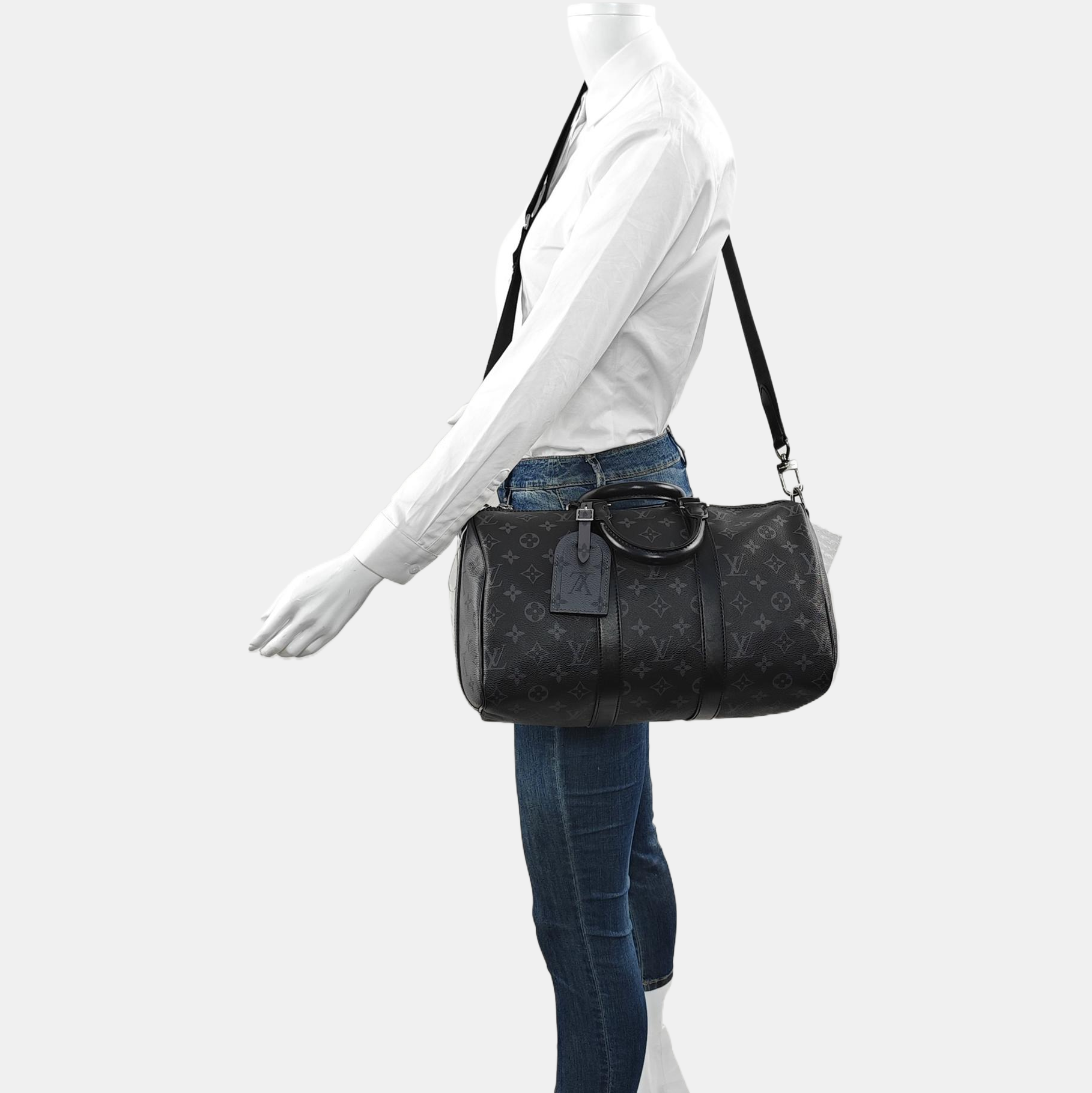 LOUIS VUITTON KEEPALL 35 Black Coated Canvas Monogram Single Shoulder Bag Handbag Crossbody Bag with Detachable Strap and Silver Hardware-(SKU)-967330082