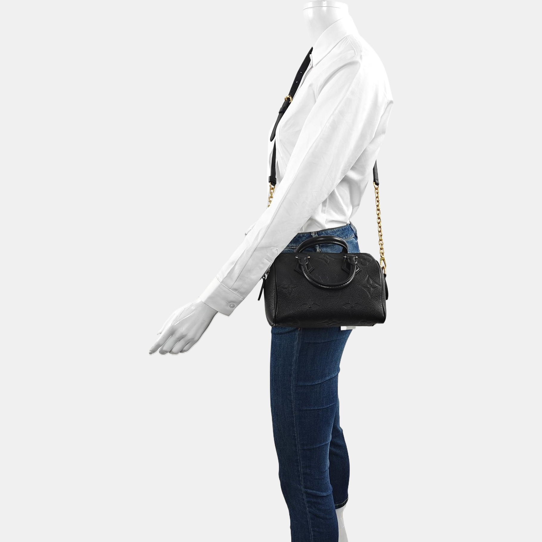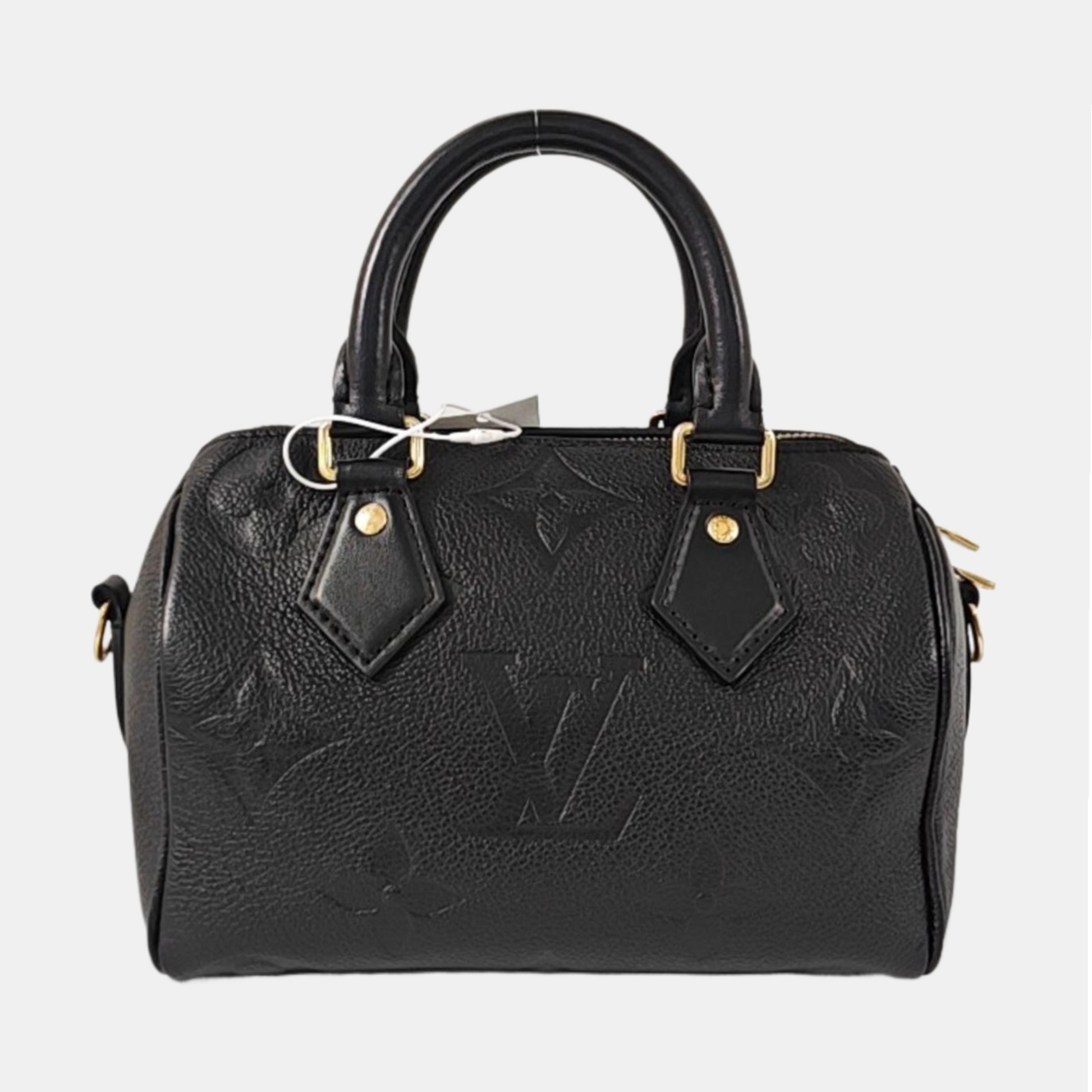LOUIS VUITTON SPEEDY Medium-sized Black Leather Monogram Embossed Boston Bag Shoulder Bag Golden Hardware Removable Shoulder Strap-(SKU)-969021720