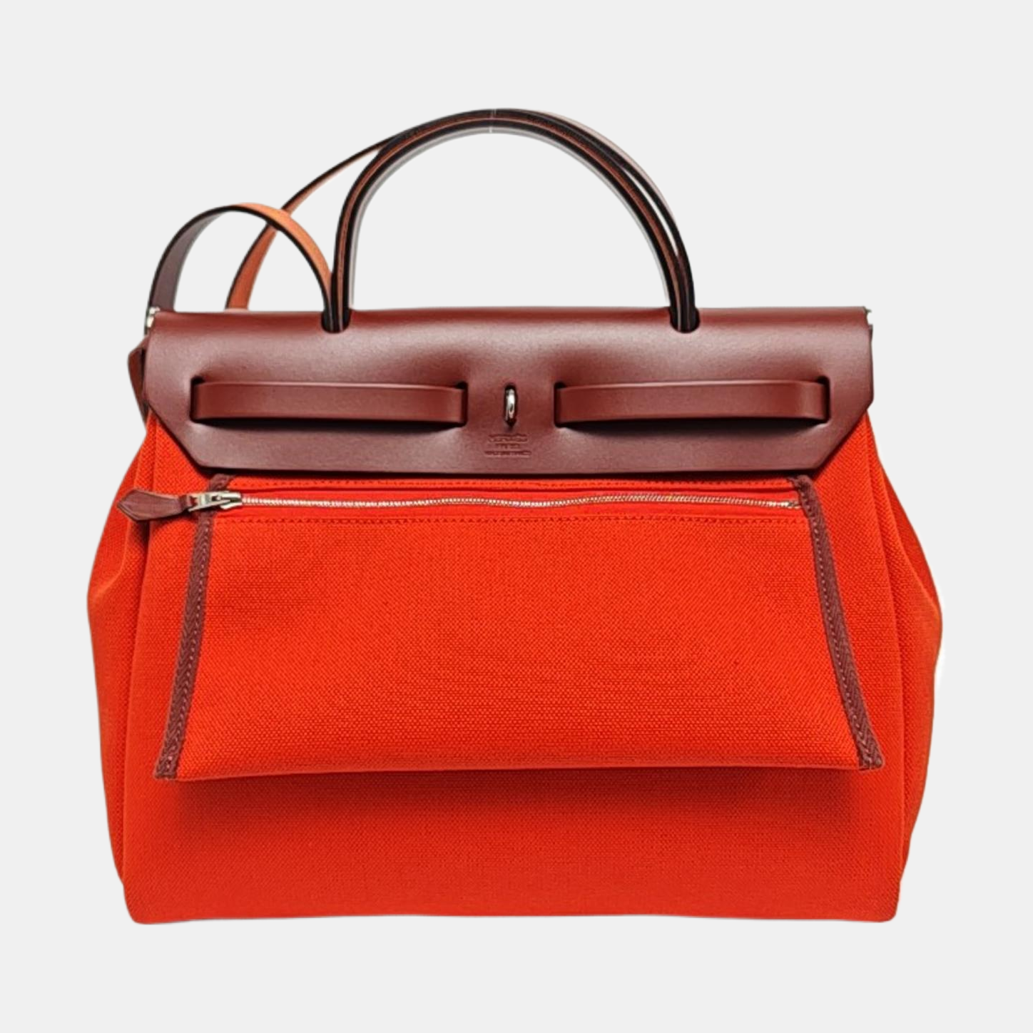 HERMÈS Herbag 31 Lotus Flower/Orange Red Canvas Single Shoulder Bag Handbag Silver Hardware Z Pockets Removable Strap-(SKU)-970002442