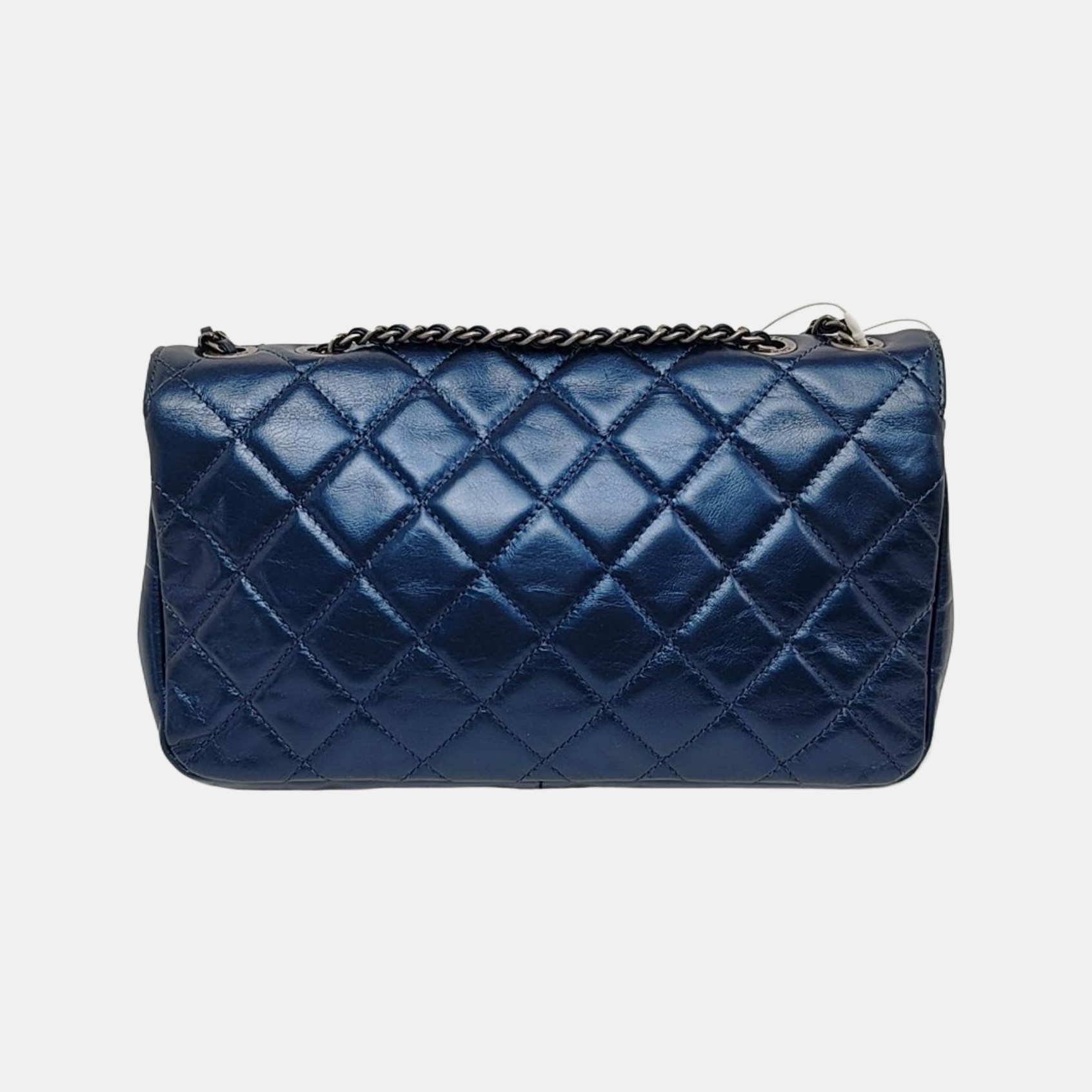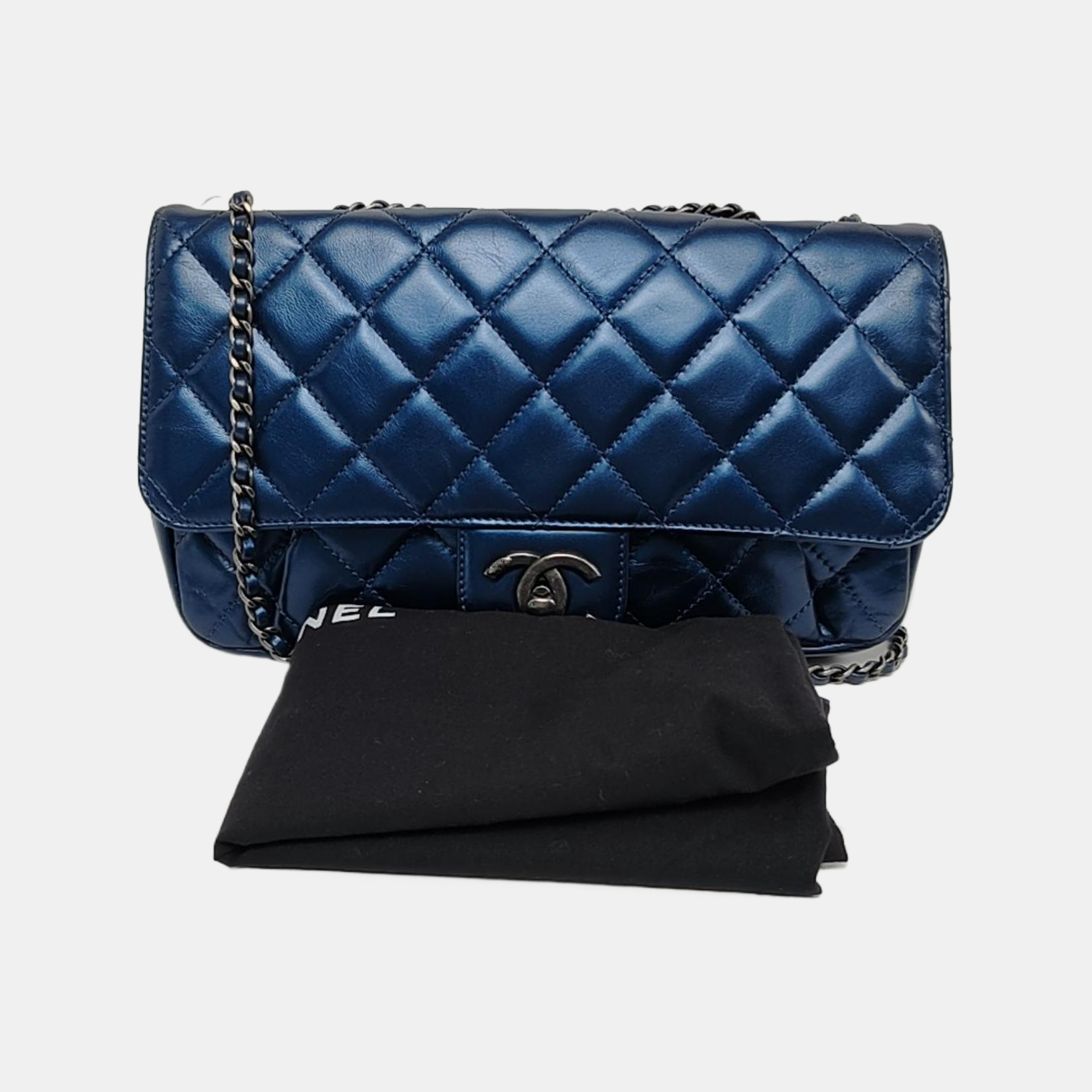 CHANEL CLASSIC FLAP Medium Dark Blue Calfskin Quilted Matelassé Shoulder Bag Rutenium Hardware 22 Clasp-(SKU)-946830693