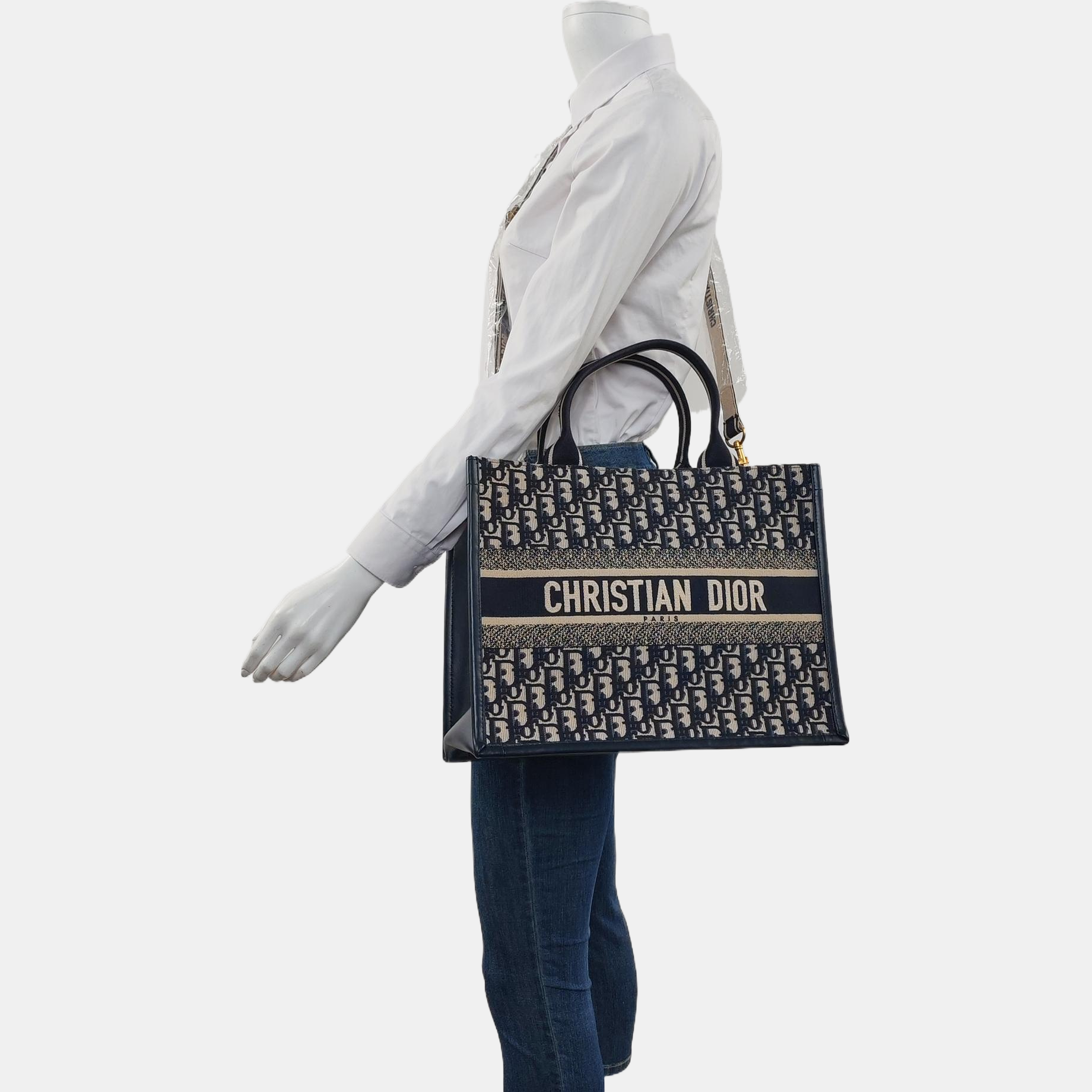 DIOR Book Tote Medium Blue Canvas Monogram Embroidered Shoulder Bag Tote Bag Golden Hardware Removable Strap-(SKU)-958662248