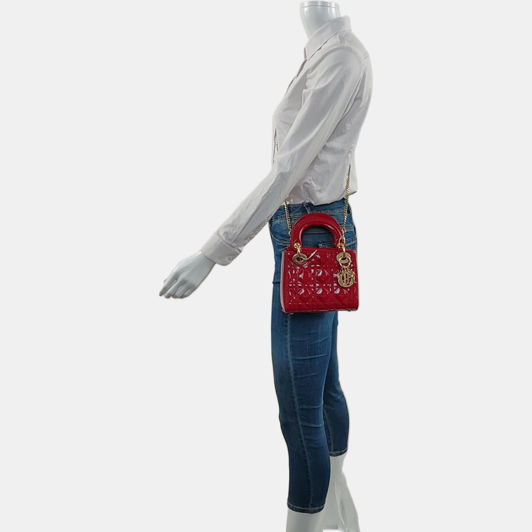 DIOR Lady Dior Mini Red Patent Lambskin Quilted Cannage Three Shoulder Bag, Crossbody Bag, Handbag with Detachable Strap-(SKU)-966772518