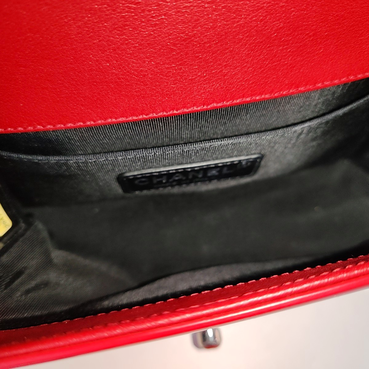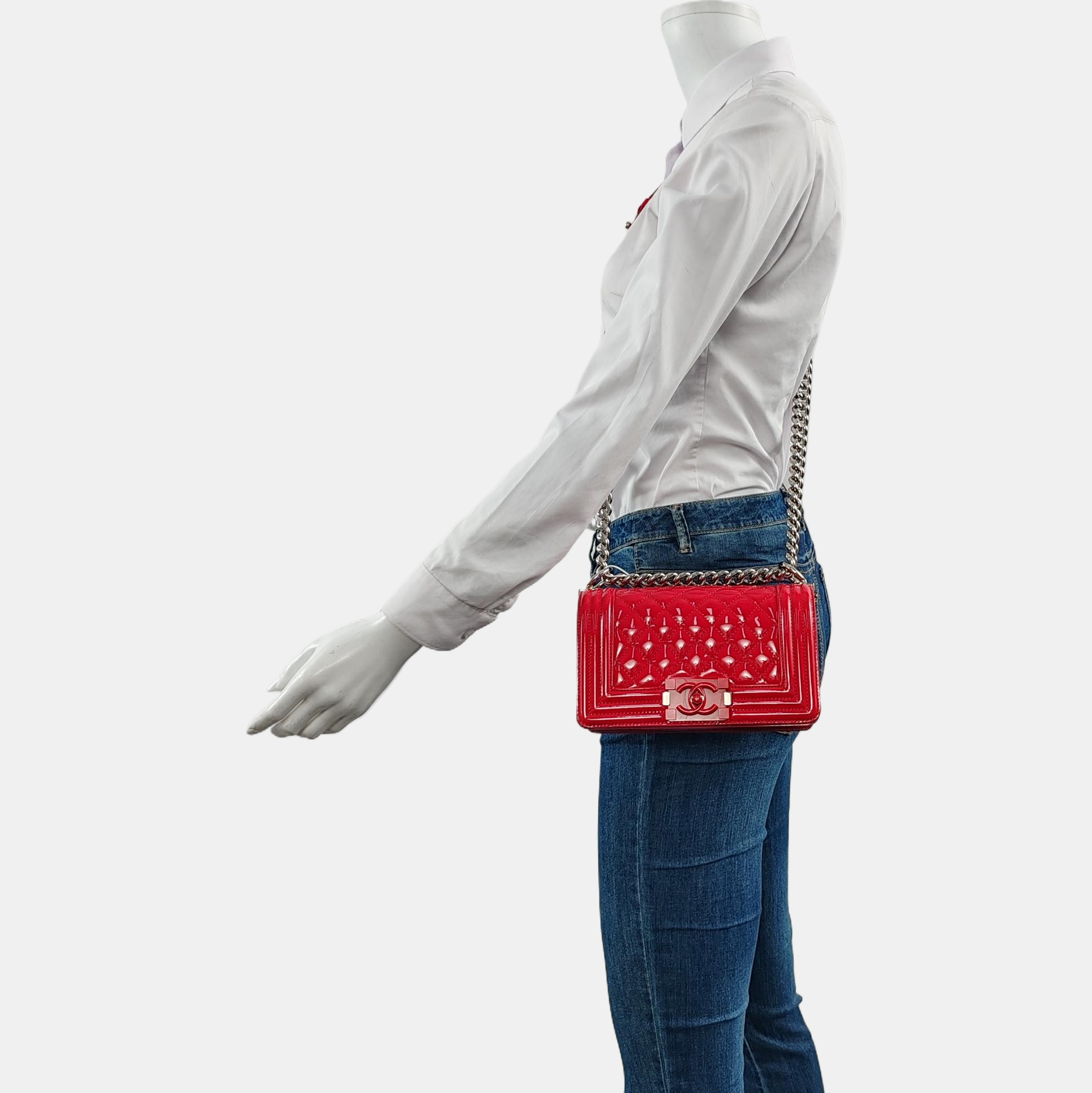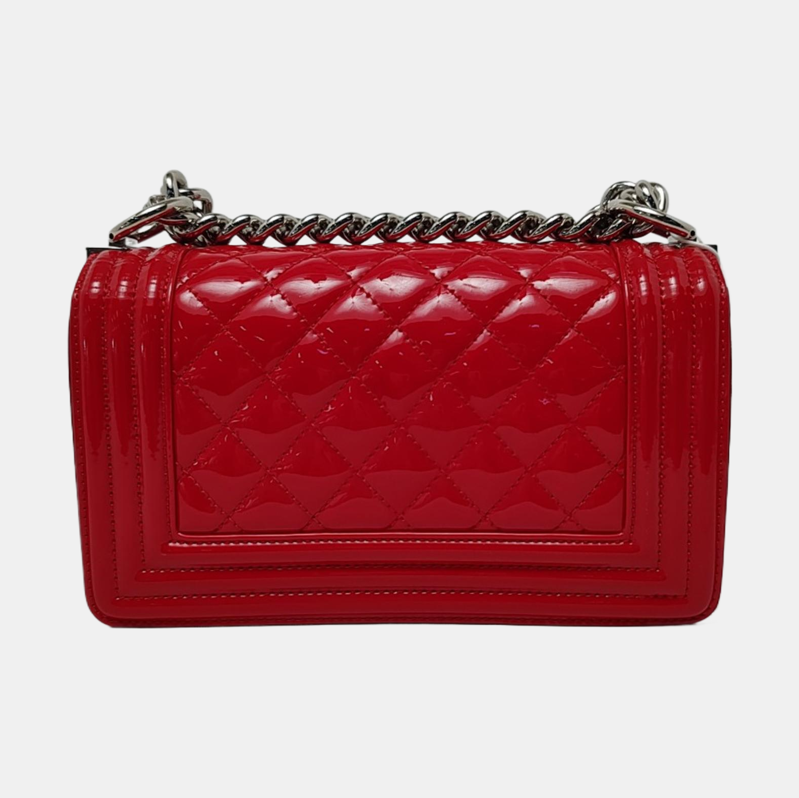 CHANEL BOY CHANEL Small Red Patent Leather Quilted Shoulder Bag Crossbody Bag with Detachable Strap Silver Hardware 20 Compartments-(SKU)-959630797