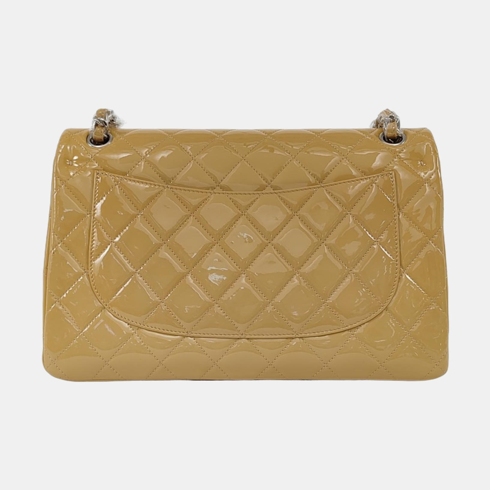 CHANEL CLASSIC FLAP Large Beige Patent Leather Quilted Diamond Pattern Shoulder Bag Handbag Crossbody Bag Silver Hardware 18 Clasp-(SKU)-947914762
