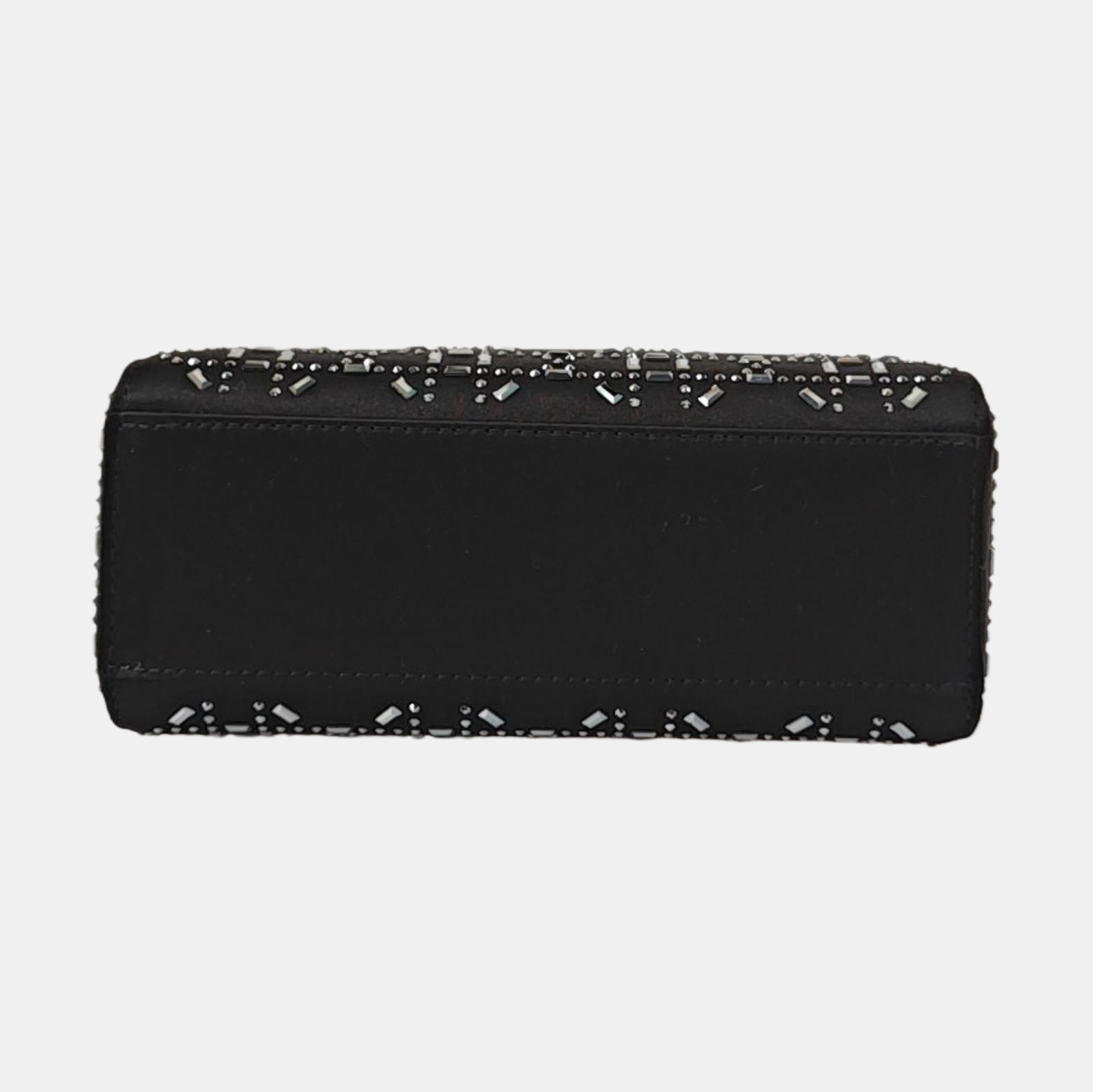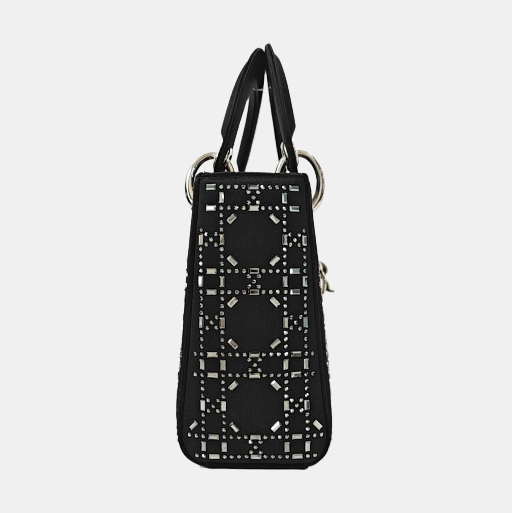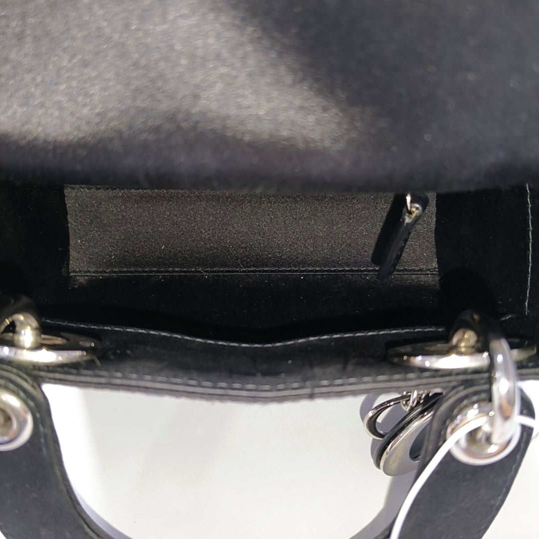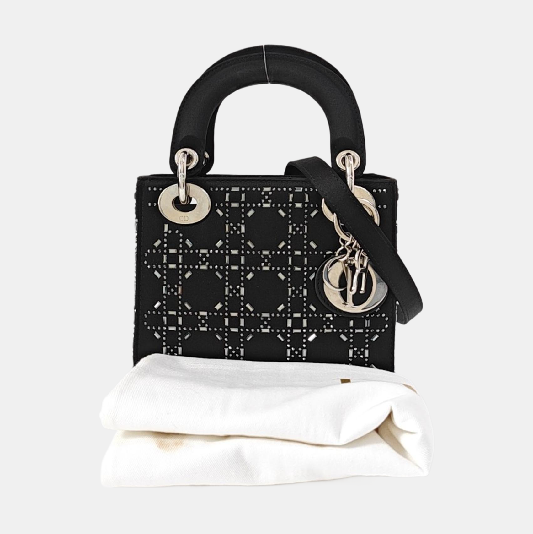 DIOR Lady Dior Mini Size Black Satin Cannage Quilted Diaper Bag Crossbody Shoulder Bag Handbag Silver Hardware Removable Strap-(SKU)-968261144