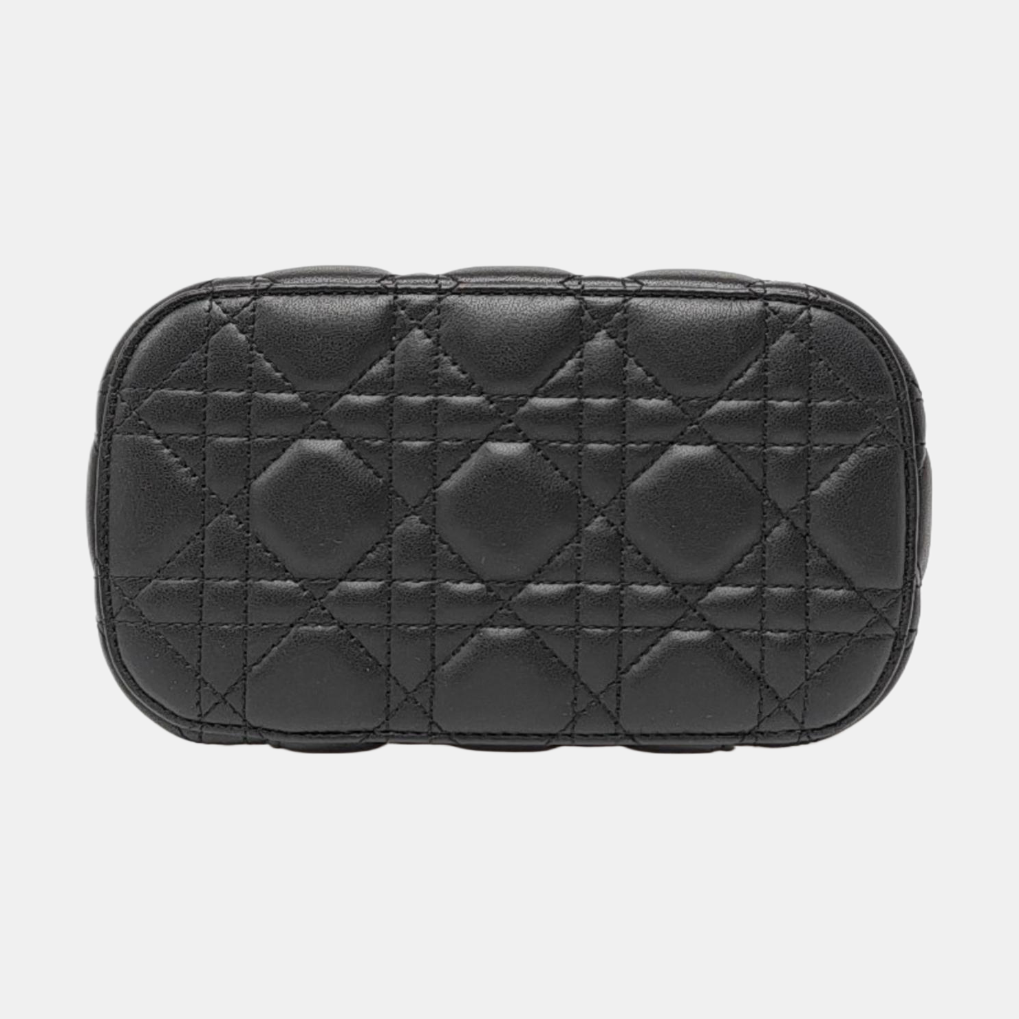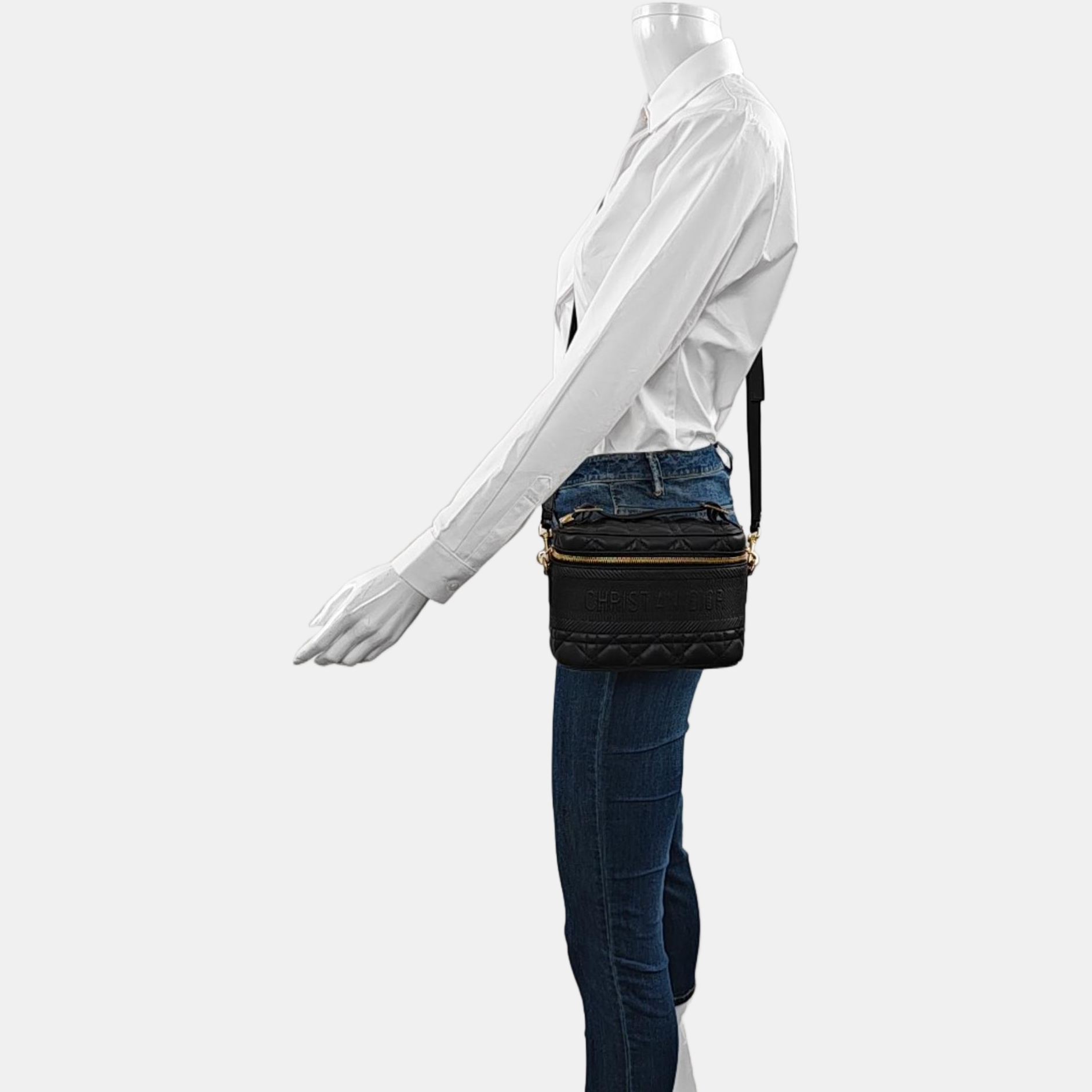 DIOR Travel Vanity Black Leather Woven Make-up Box Single Shoulder Bag Crossbody Bag Handbag Removable Strap Gold Hardware Accessories Included-(SKU)-968827217