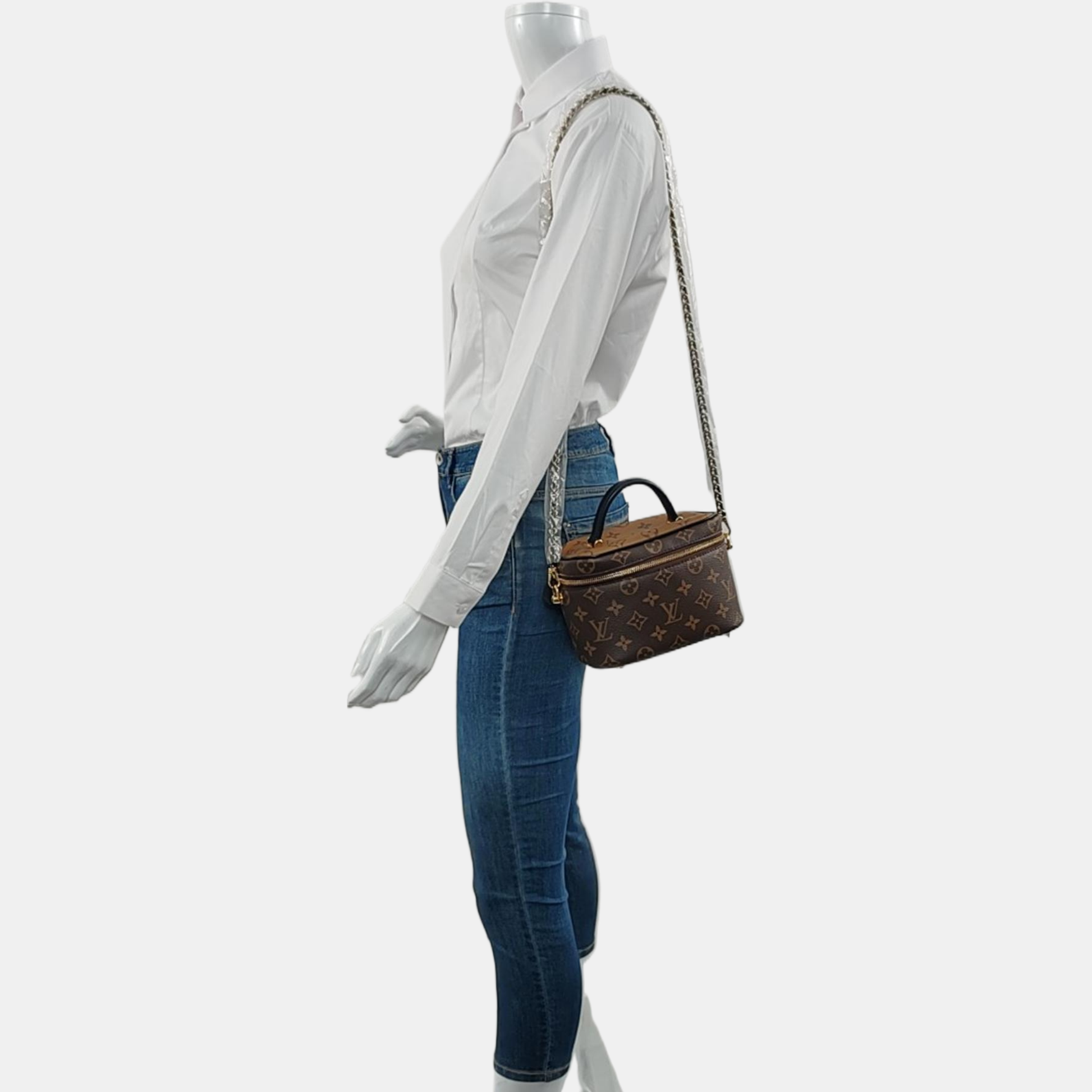 LOUIS VUITTON VANITY CHAIN POUCH Small Brown Coated Canvas Monogram Vernis Cosmetic Bag Shoulder Bag Crossbody Bag Handbag Gold Hardware Removable Shoulder Strap-(SKU)-966448523