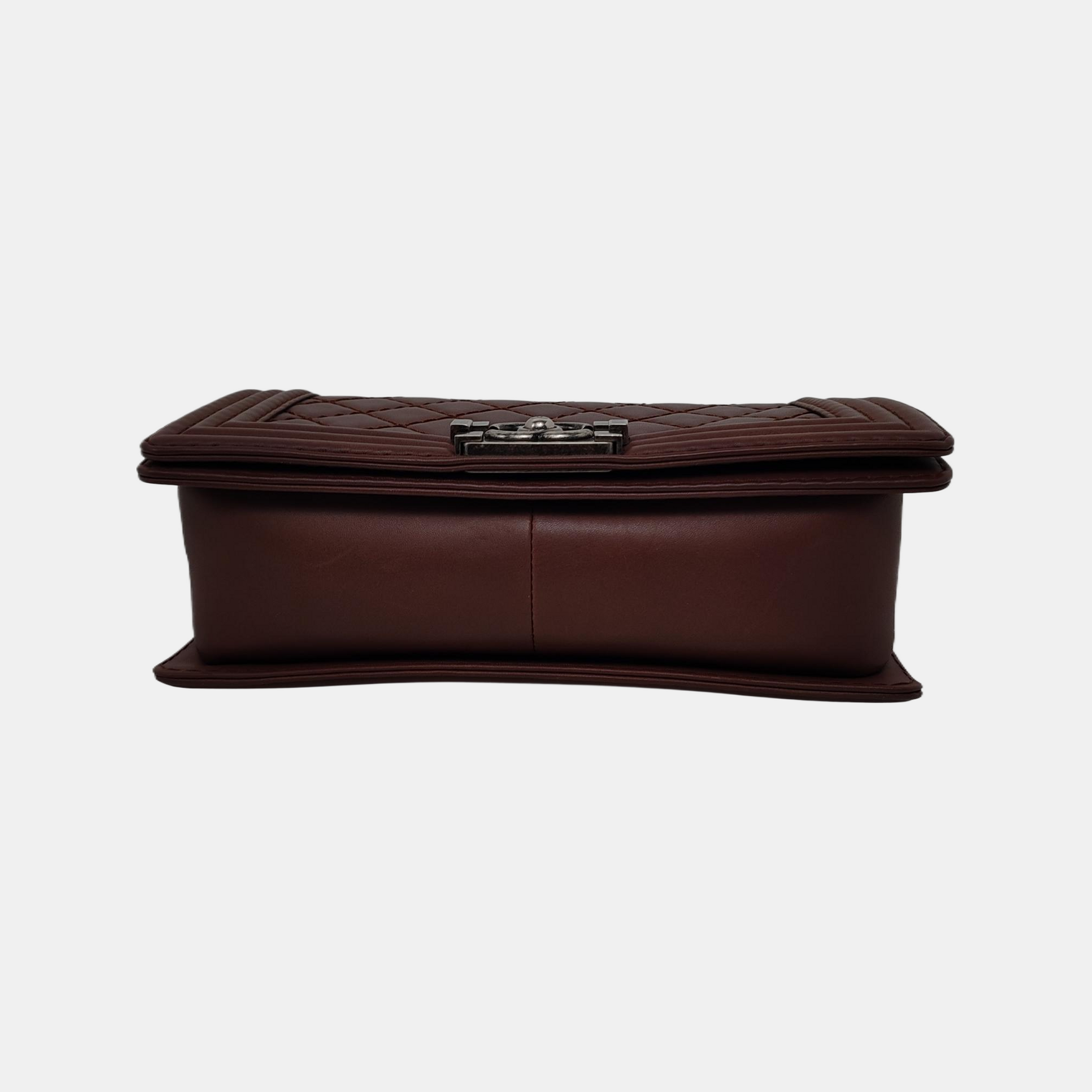 CHANEL BOY CHANEL Medium Burgundy Calfskin Quilted Shoulder Bag Tote Crossbody Bag Ruthenium Hardware 18K Clasp-(SKU)-946021622