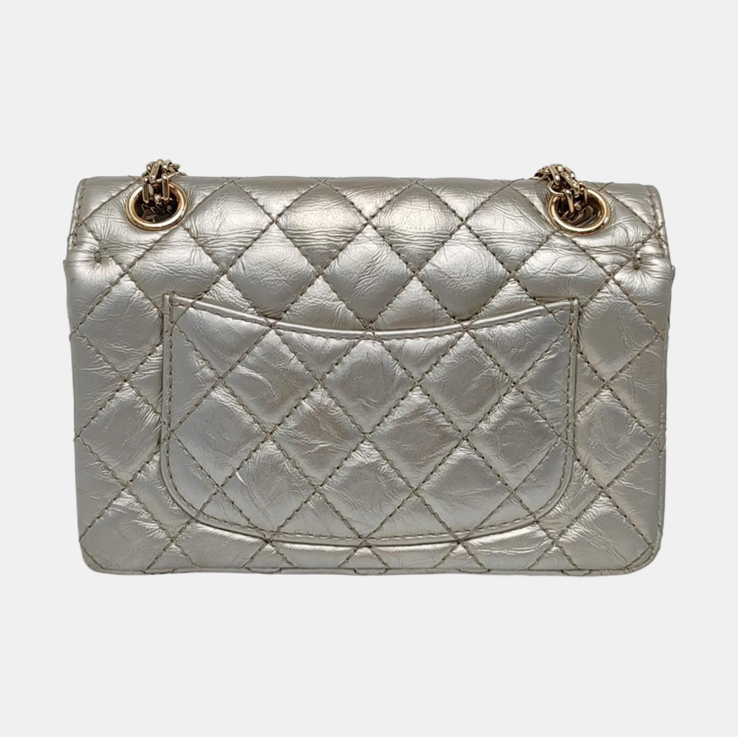 CHANEL 2.55 Small Silver Leather Quilted Chain Shoulder Bag with Gold Hardware, 30 Clasps-(SKU)-965946832
