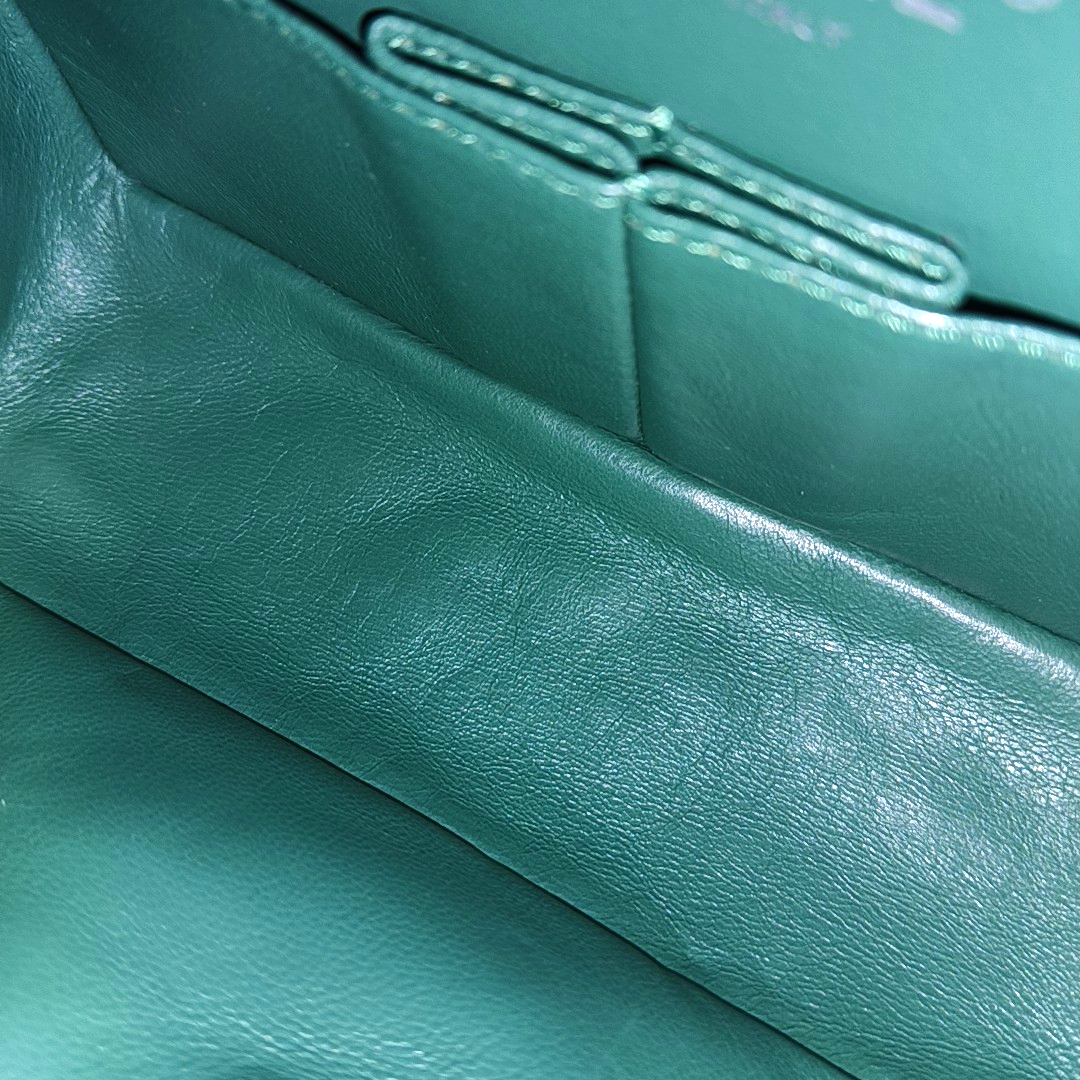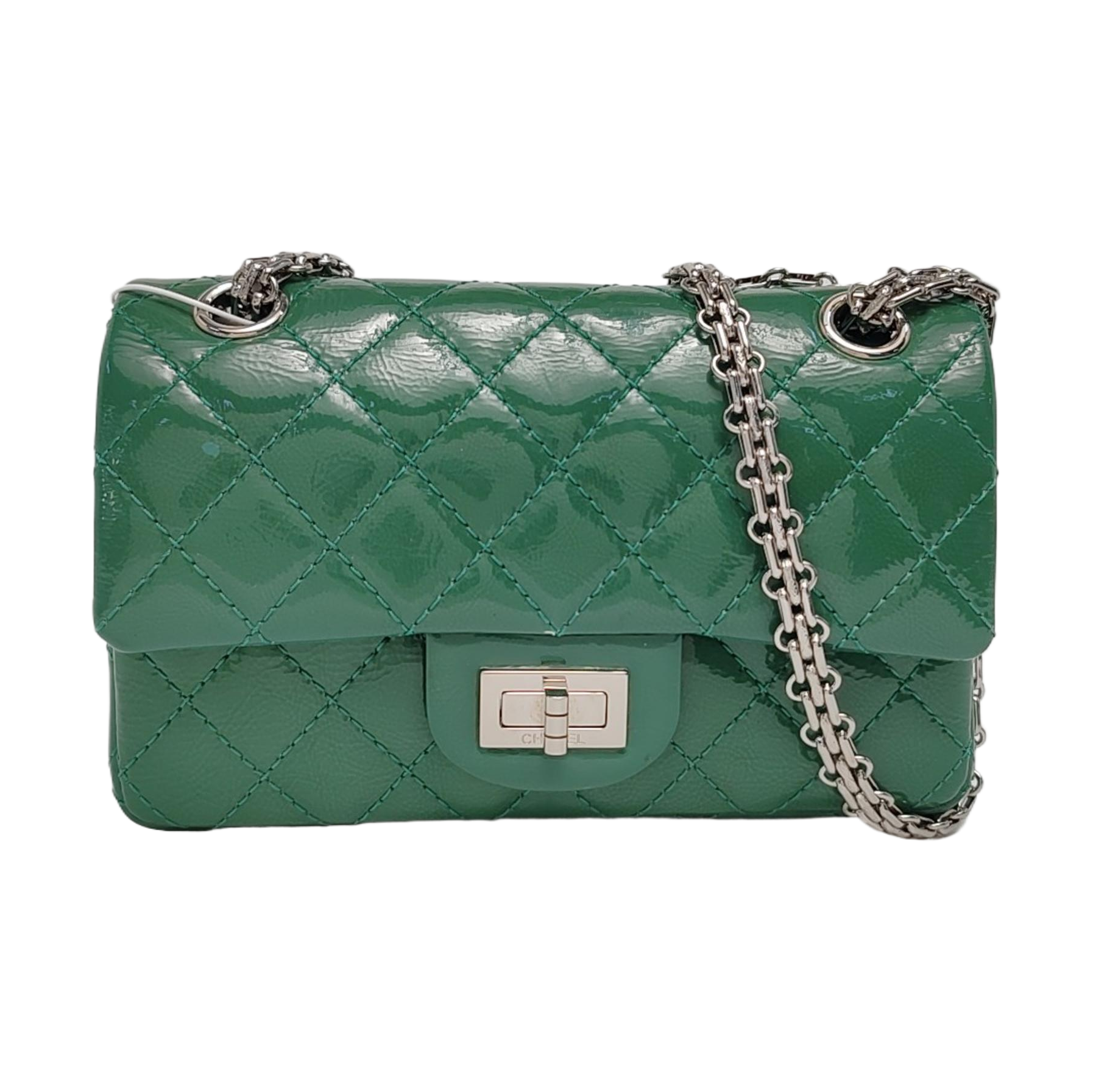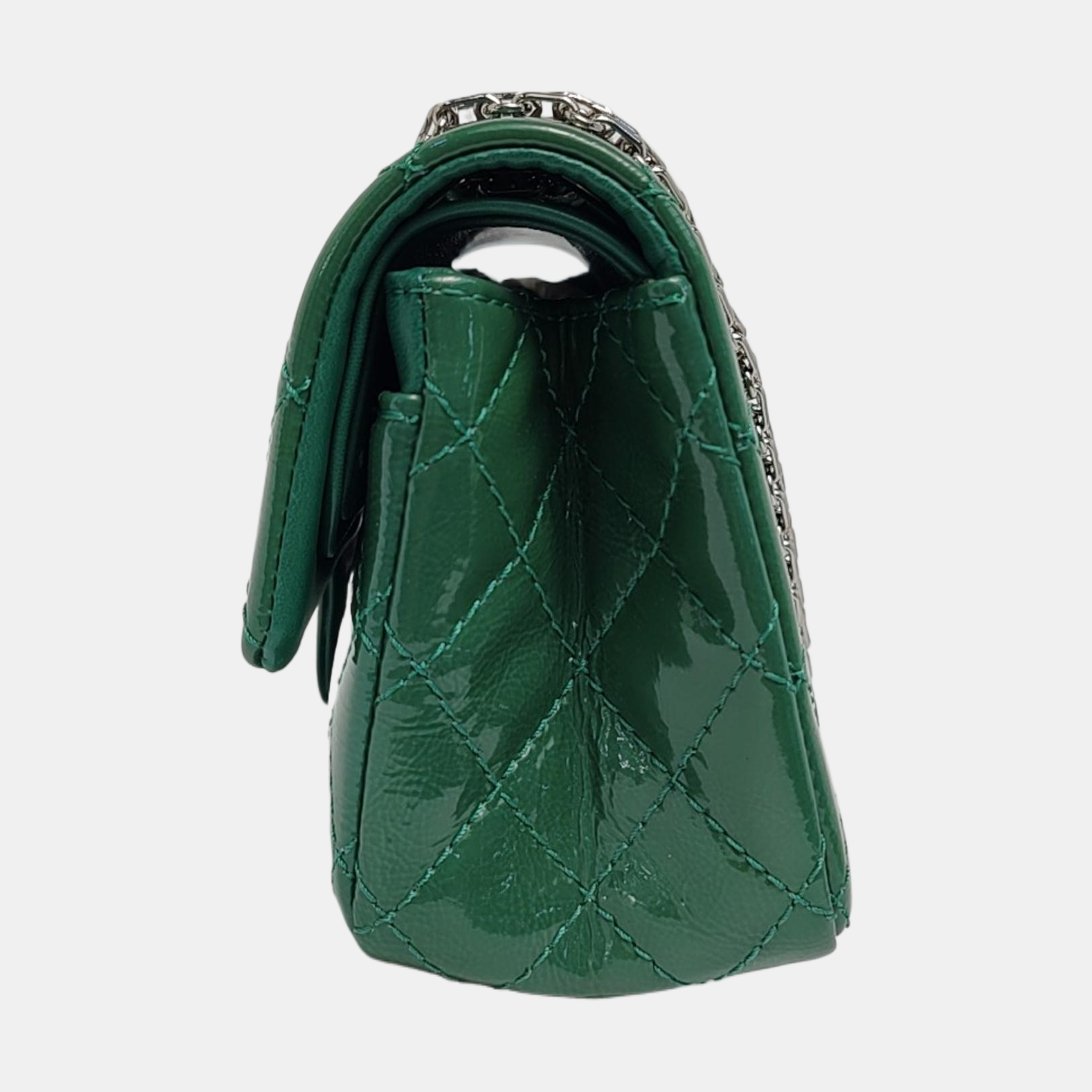 CHANEL 2.55 Small Green Patent Leather Quilted Chain Shoulder Bag with Silver Hardware, 14 Clasps-(SKU)-963604187