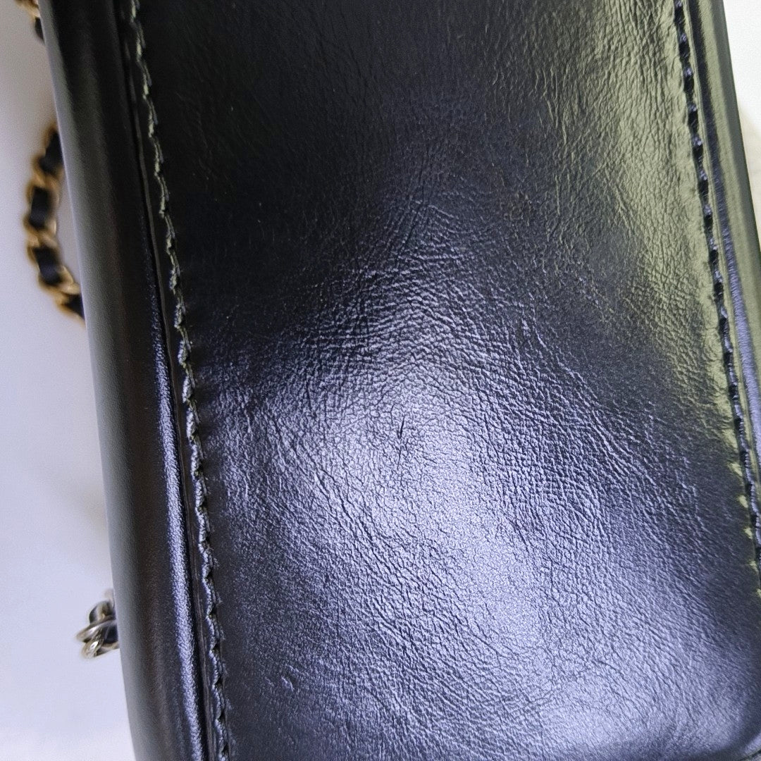 Detailed description: Strap、Slight wear at the opening,Slight stains on the front,Front、Slight creases on the back side,Slight indentation on the bag body,Edge wrapping around the opening、Moderate stains on the back side