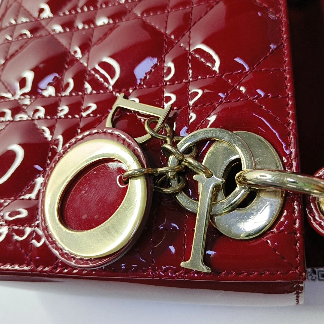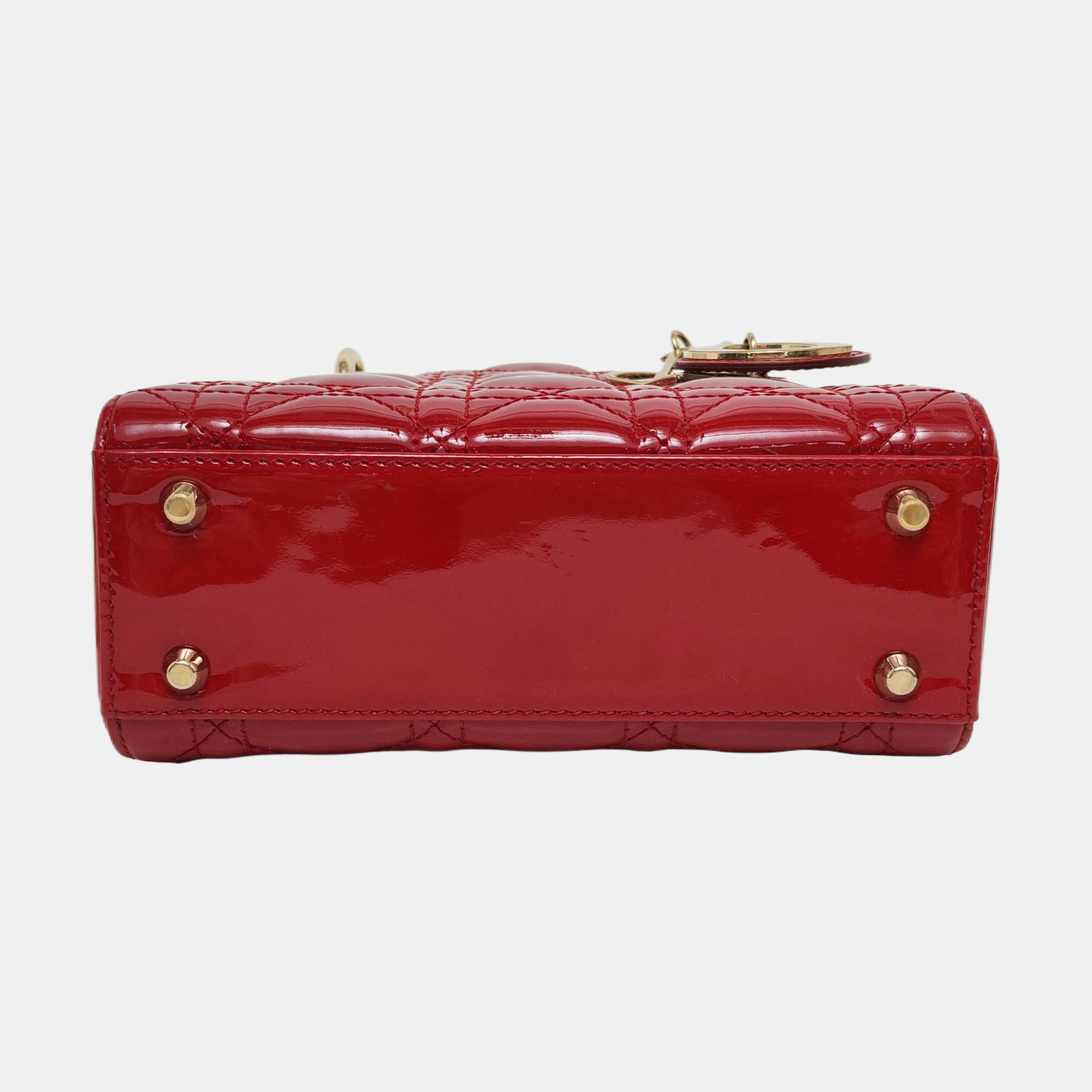 DIOR Lady Dior Mini Red Patent Leather Quilted Cannage Three-Panel Single Shoulder Bag Handbag Crossbody Bag Gold Hardware Removable Shoulder Strap-(SKU)-969715259