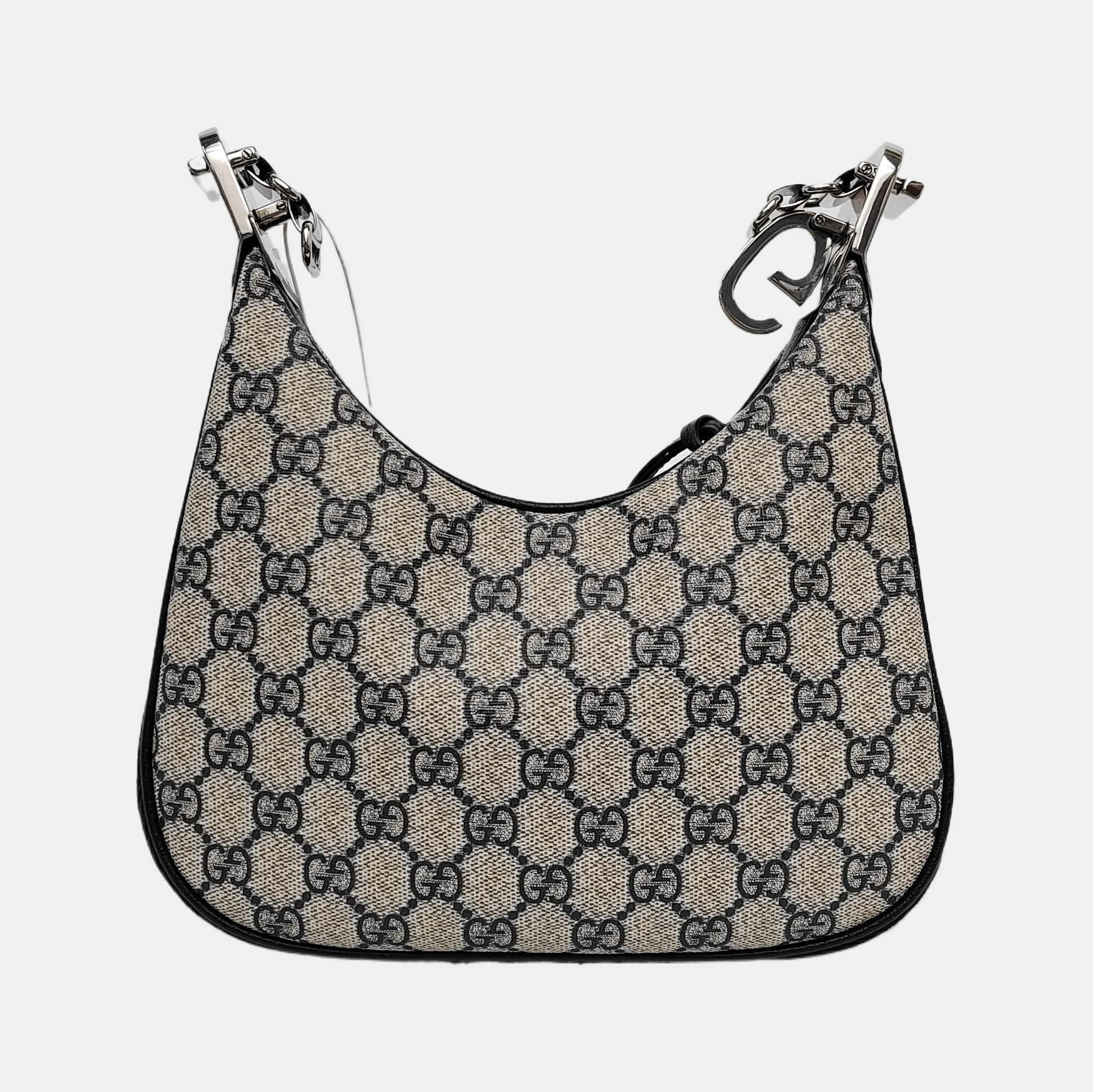 GUCCI Attache Small Beige Coated Canvas Monogram Striped Web Shoulder Bag Crossbody Bag Silver Hardware 2 Removable Straps-(SKU)-942240988