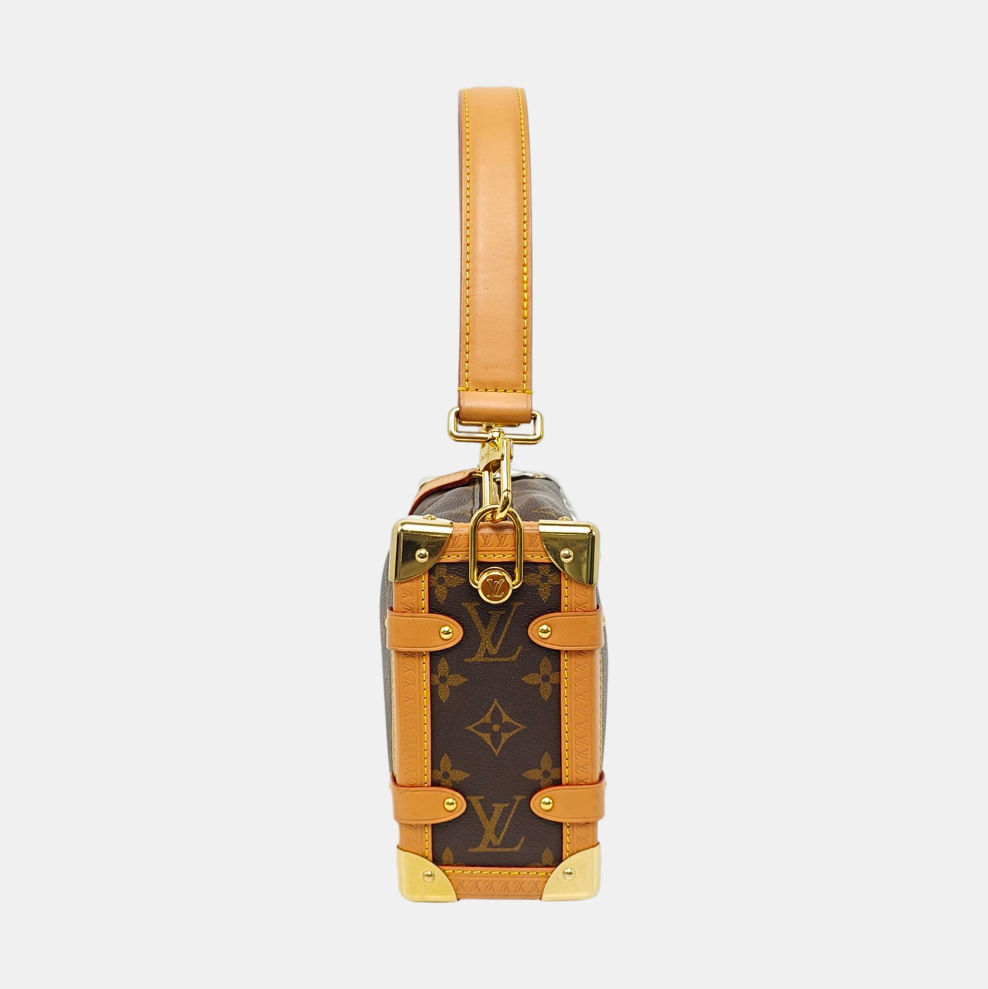 LOUIS VUITTON SIDE TRUNK Medium Monogram Brown Coated Canvas Riveted Soft Box Shoulder Bag Crossbody Bag Golden Hardware 2 Removable Straps-(SKU)-971266258