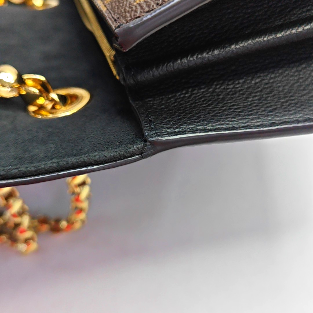 Detailed description: Strap、Edge wrapping around the opening、Slight stains on the hardware,Slight cracking of the flip cover,Moderate cracking at the opening
